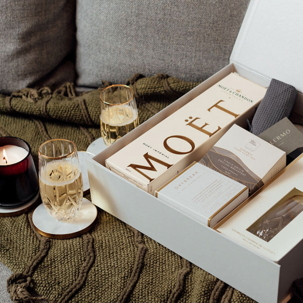 Pop the bubbly and toast to the start of a grand thing with 24-carat gold-rimmed glasses and Moët & Chandon.