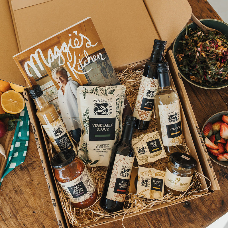 Maggie Beer's iconic Maggie's Kitchen cookbook belongs in every kitchen, find it and more in this hamper.