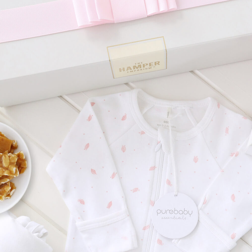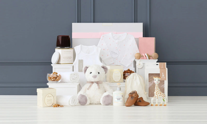Delight the proud parents and welcome their baby girl into the world with this luxury baby hamper of gifts.