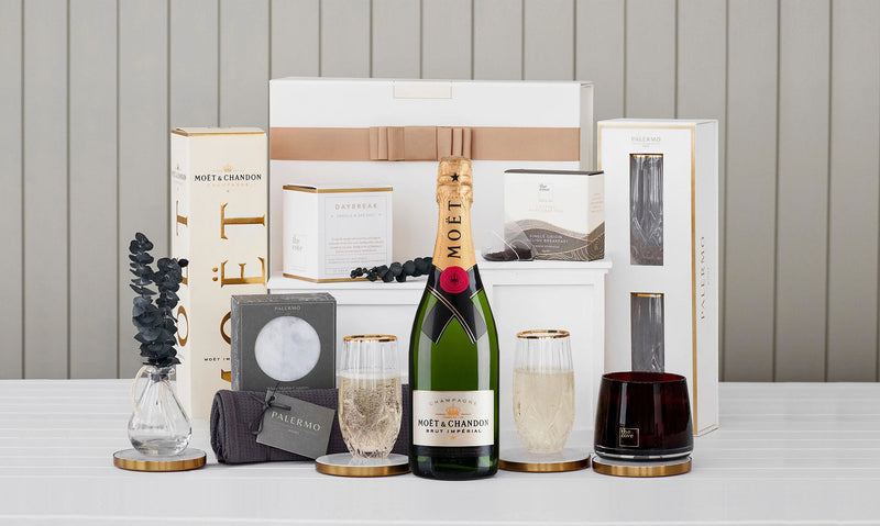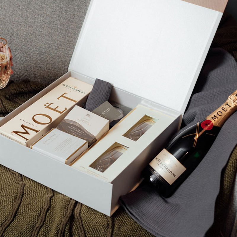 Pop the bubbly and toast to the start of a grand thing with 24-carat gold-rimmed glasses and Moët & Chandon.