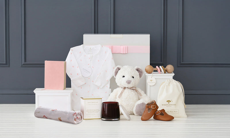 Celebrate a brand new baby girl and her proud parents with a baby hamper full of gifts from Whistlewood.