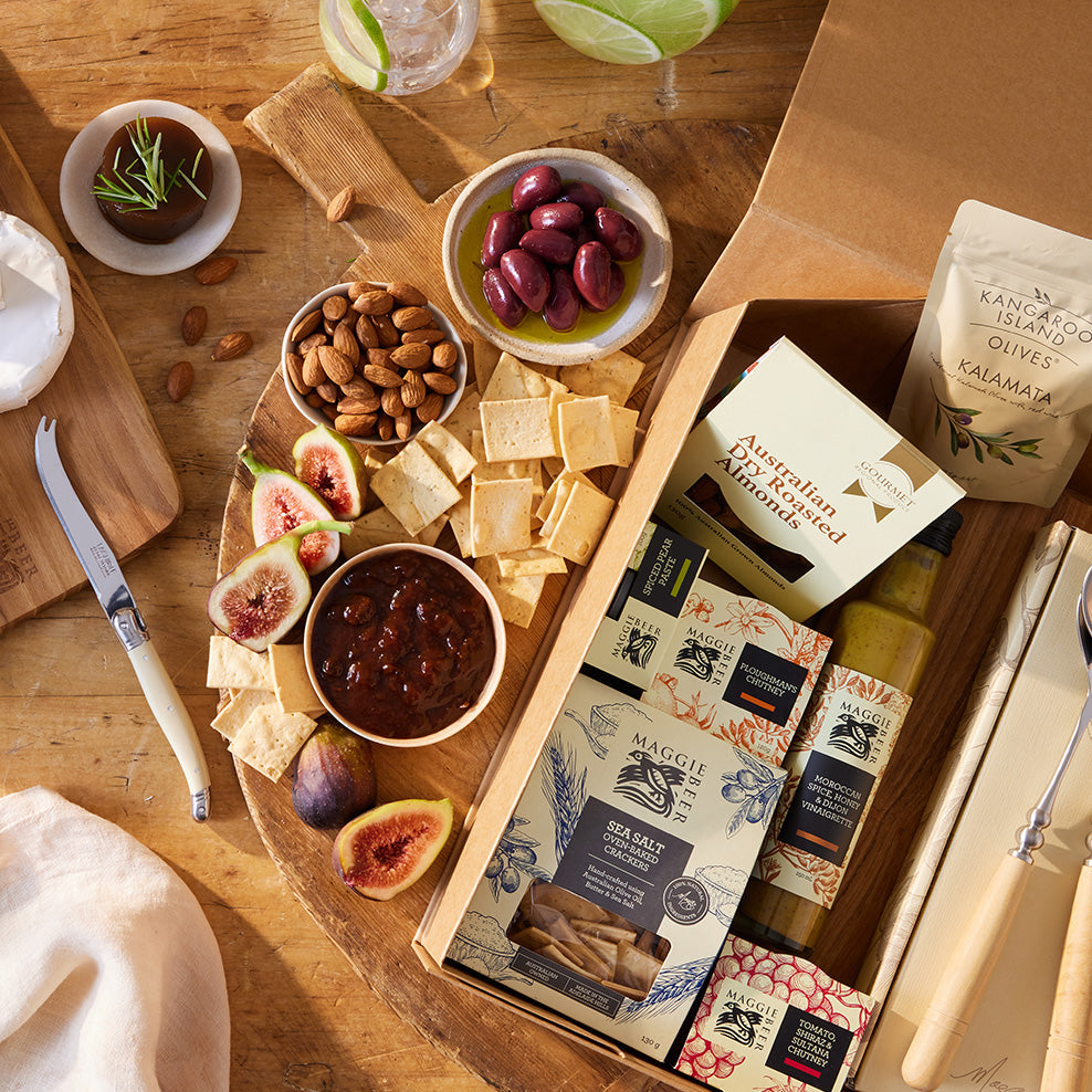 This hamper is a cheese platter in a box, featuring everything needed for a grazing lunch - just add cheese!