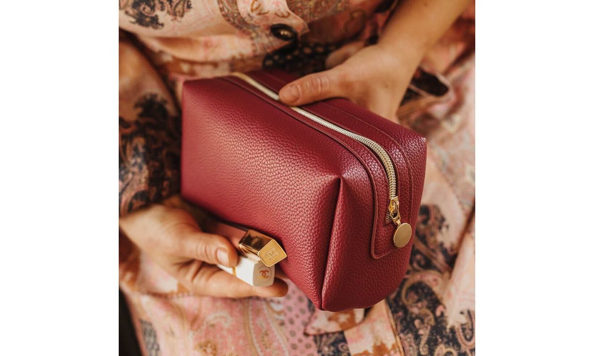 Psst... you've found our Burgundy Cosmetic Bag! This little gem is so popular, we've tucked it away inside our fabulous hampers, making every gift extra special. Want to find it? Dive into our hamper selection and see what other hand-picked products you can find!