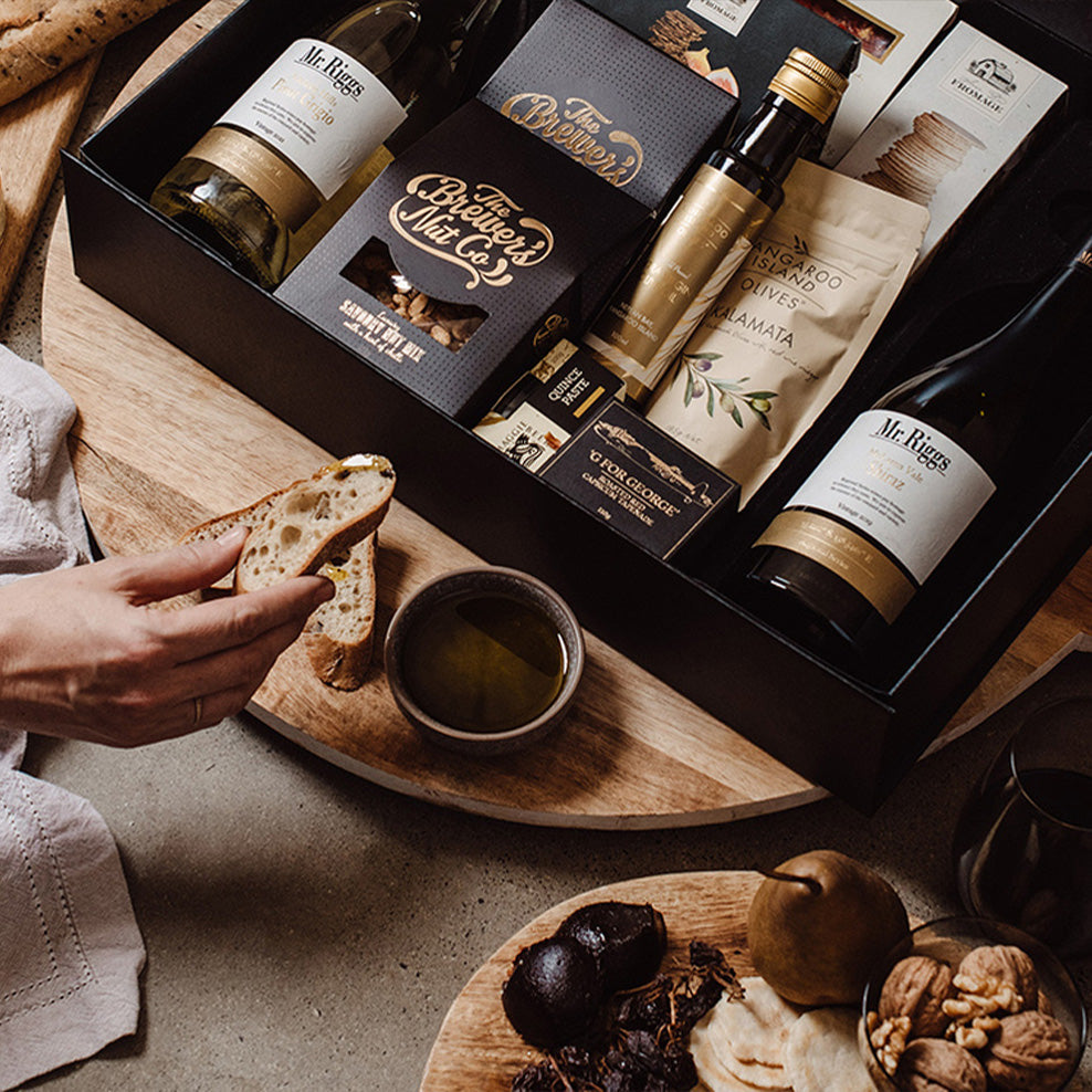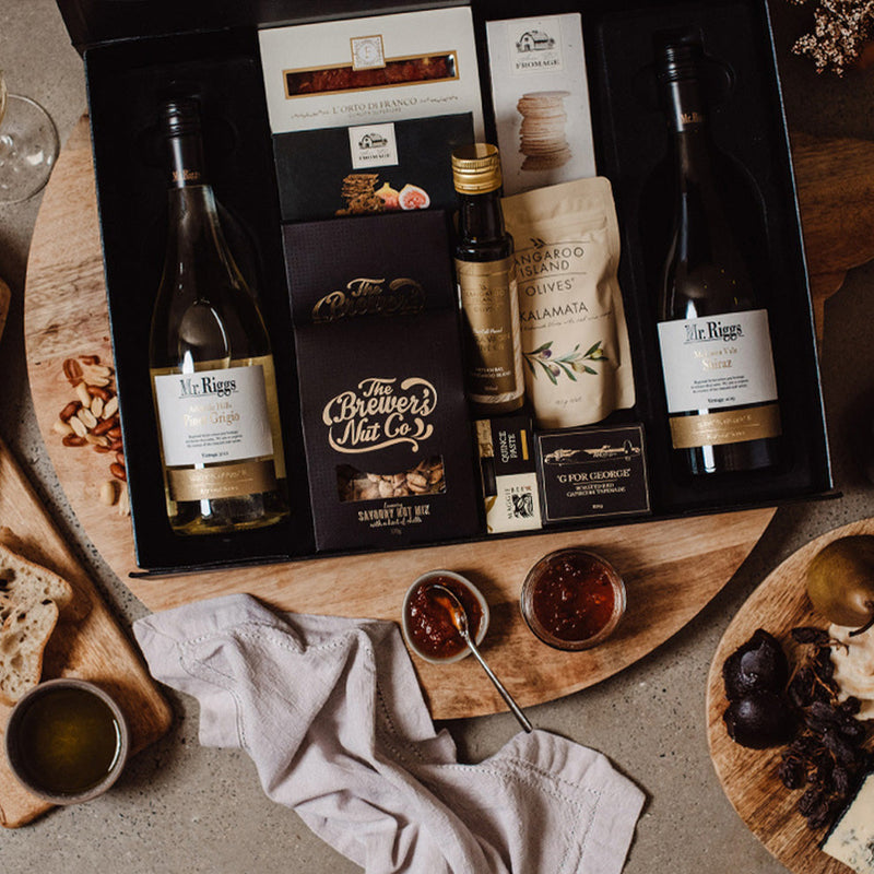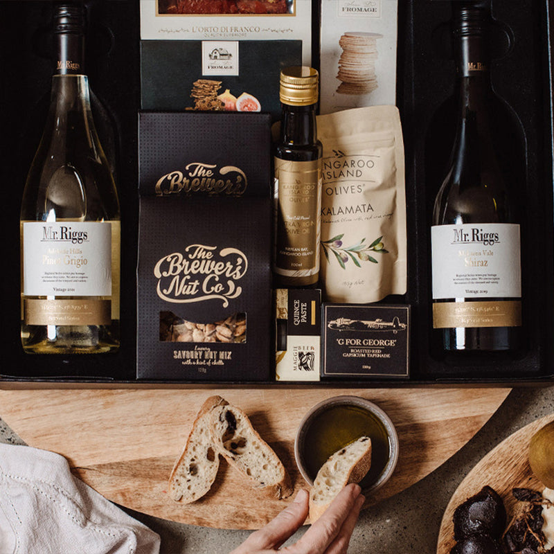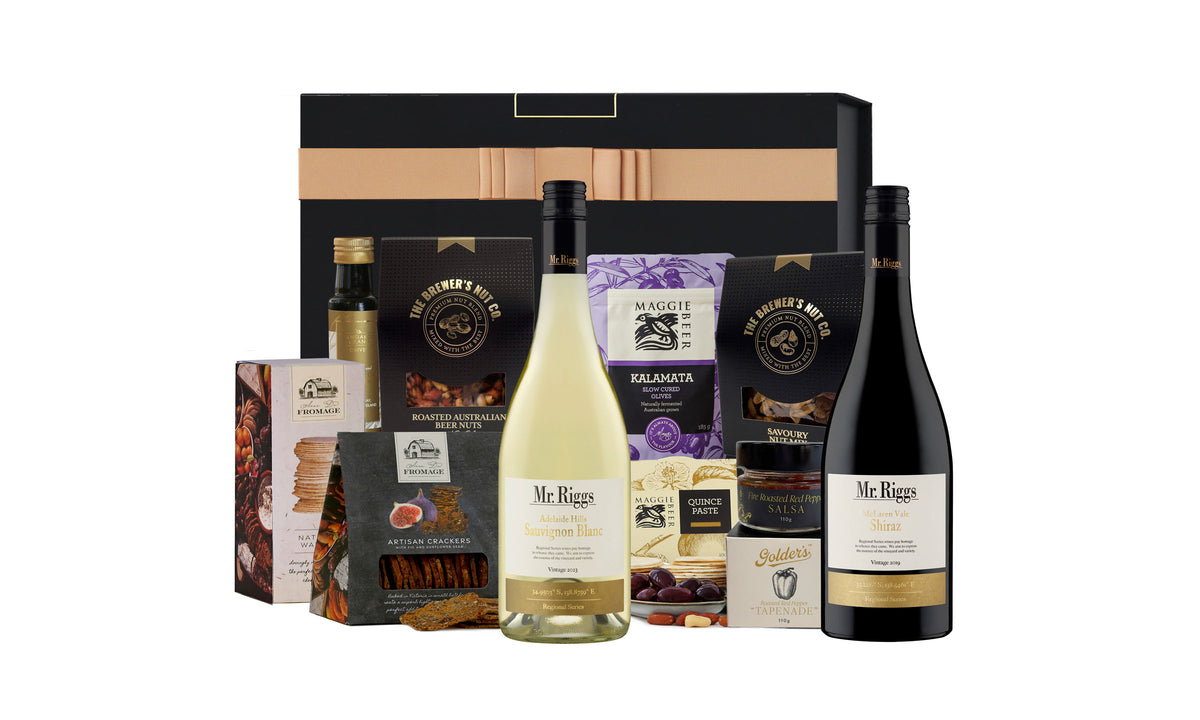 Lovers of South Australian wine will love the Pinot Grigio and Shiraz in this hamper, plus gourmet nibbles.