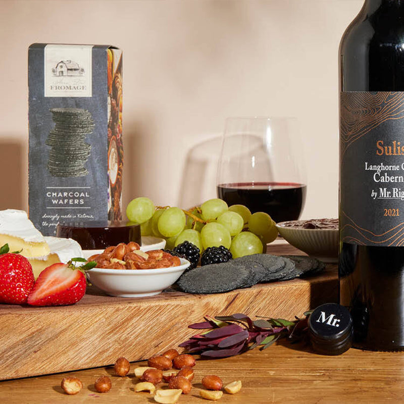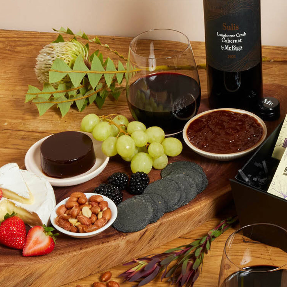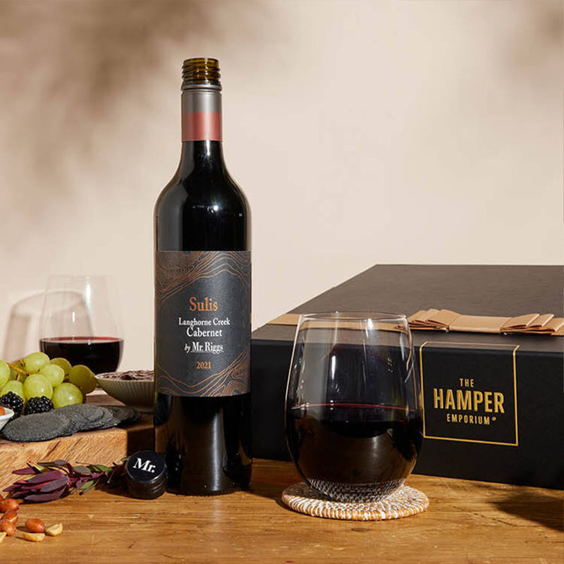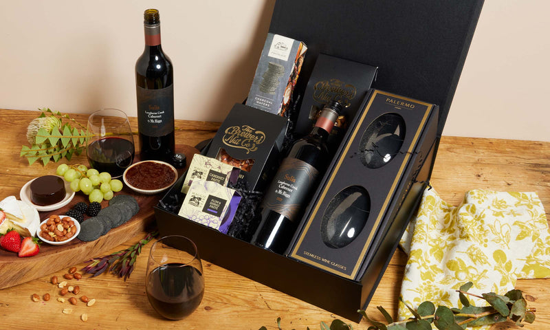Give the toast and the glasses with this red wine hamper featuring a cabernet, glasses, and moreish nibbles.