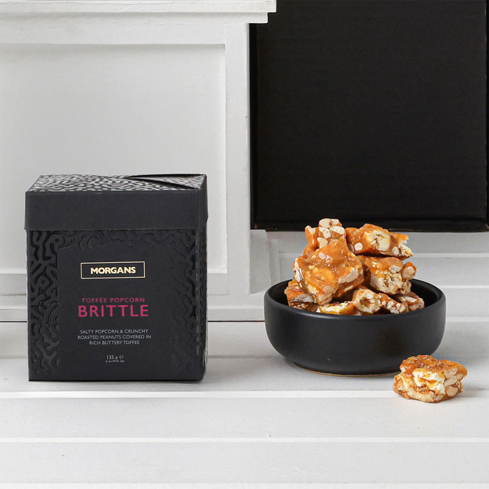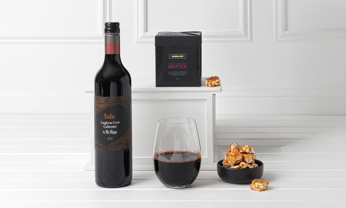 Celebrate with a little luxury hamper featuring South Australian red wine and Toffee Popcorn Brittle.