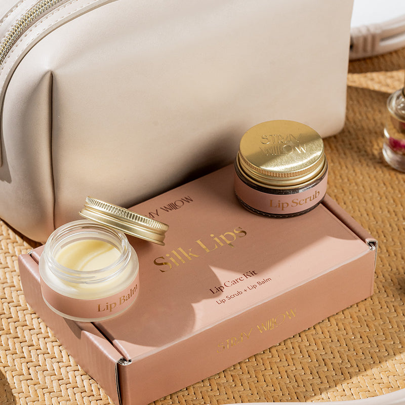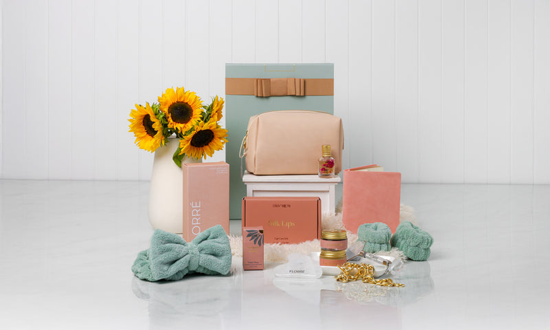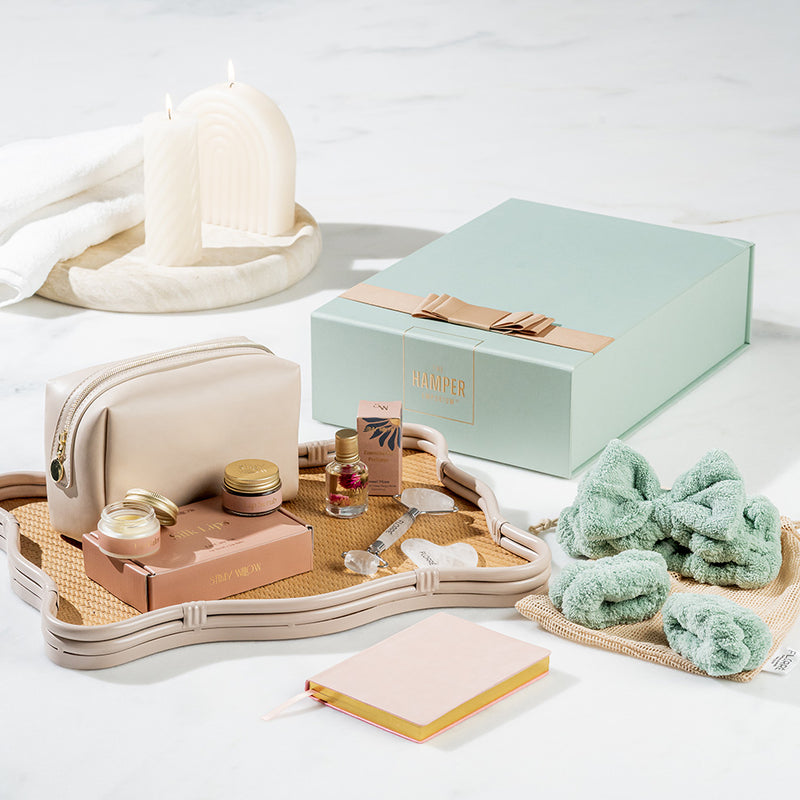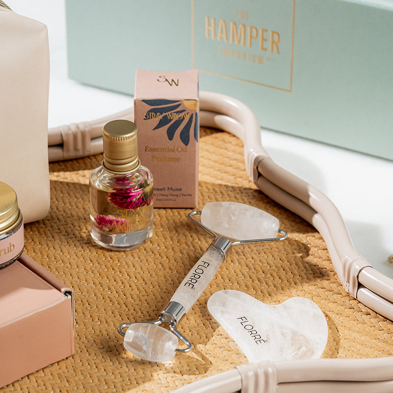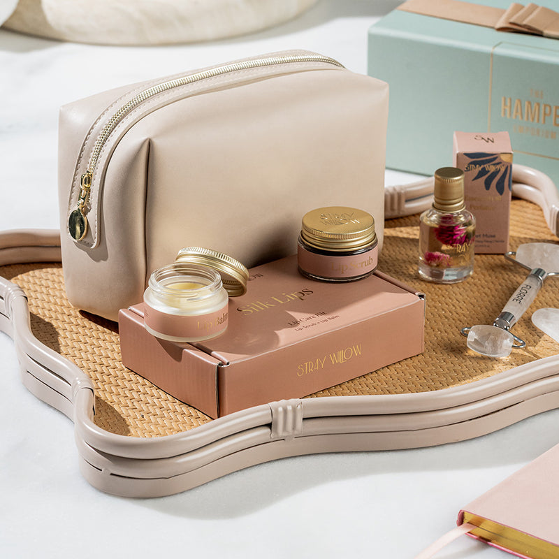 A beautifully curated Stray Willow pamper hamper featuring a silk lip kit, crystal eye roller & Gua sha set, essential oil perfume roller and spa headband set for a luxurious self-care moment.