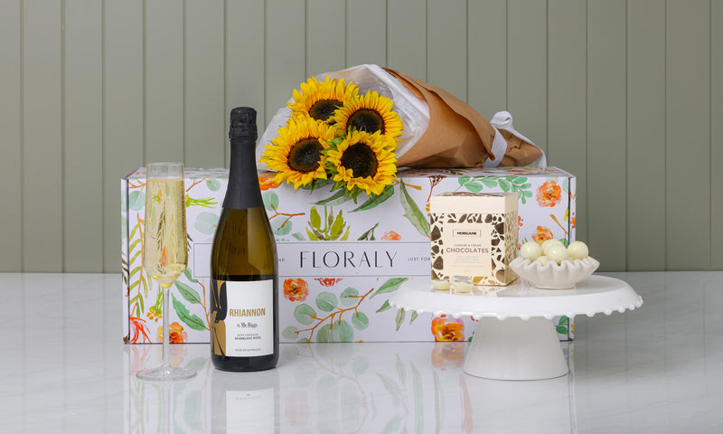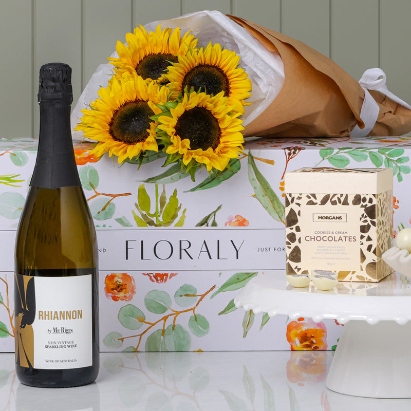 Send a bouquet of beautiful sunflowers and sparkling wine to your gift recipient with this gift box.