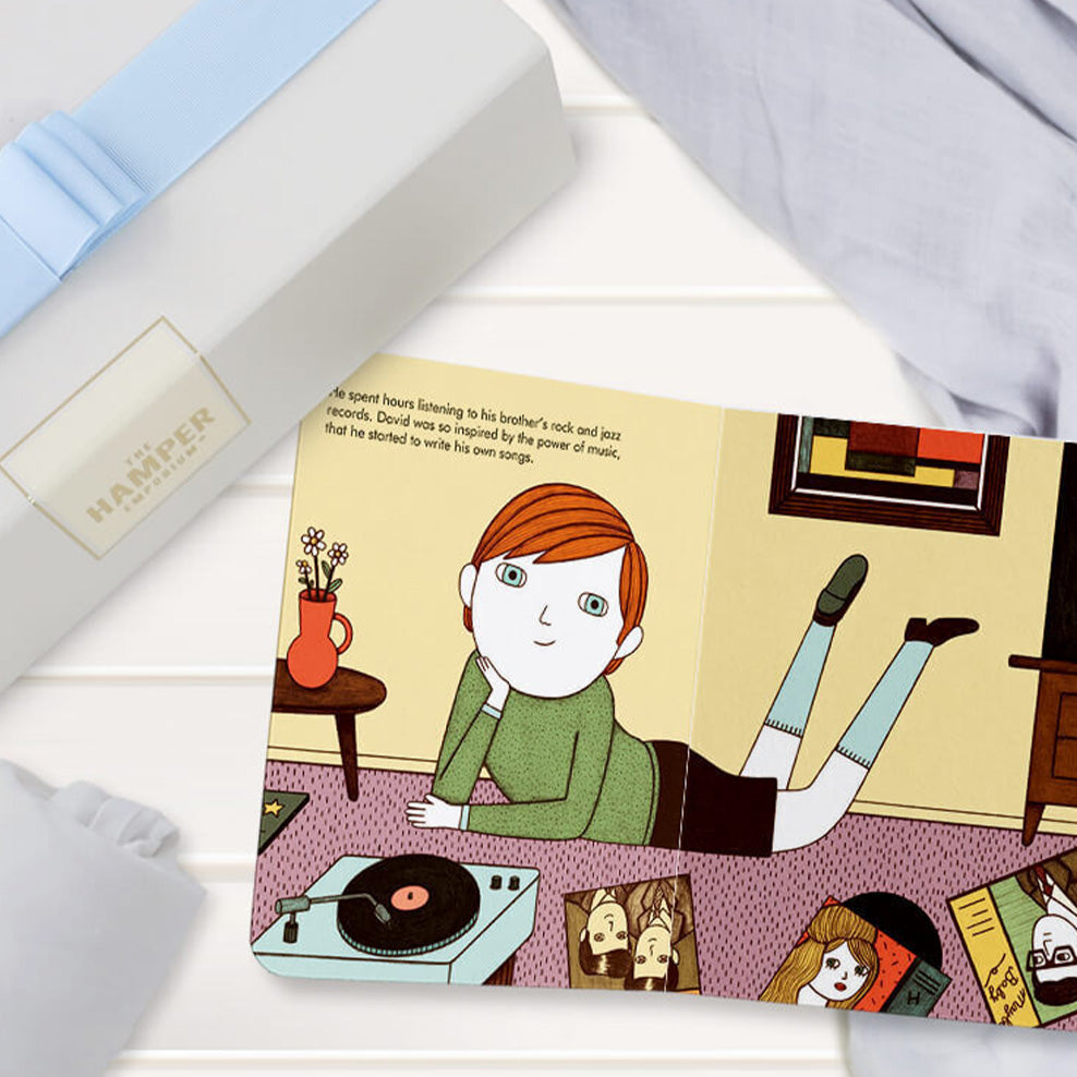 Show the little baby boy all the magical, musical things he can do one day with this David Bowie baby hamper.