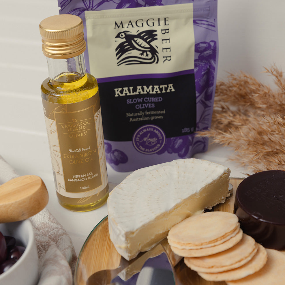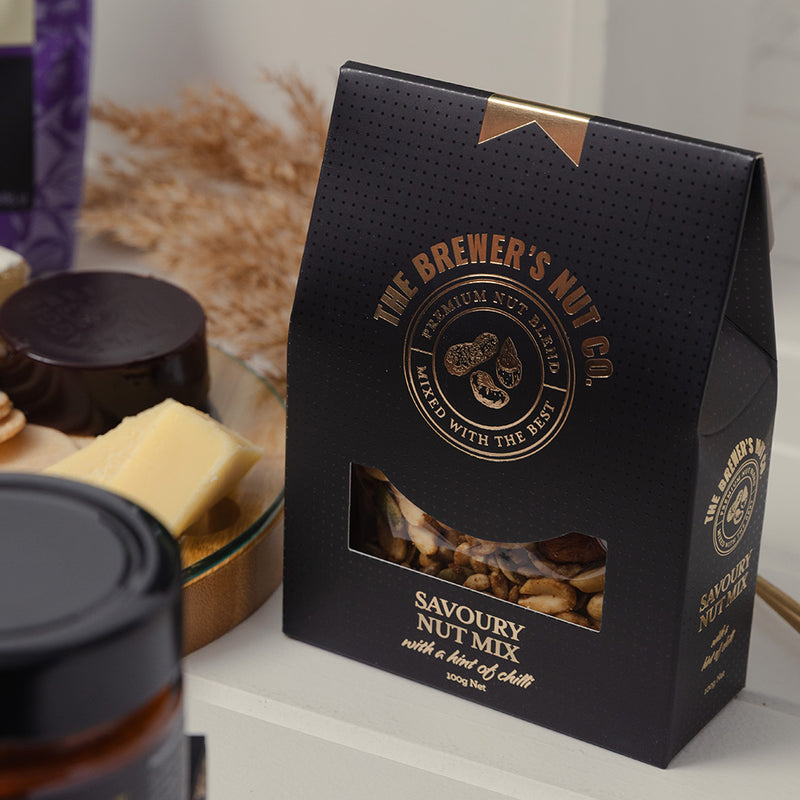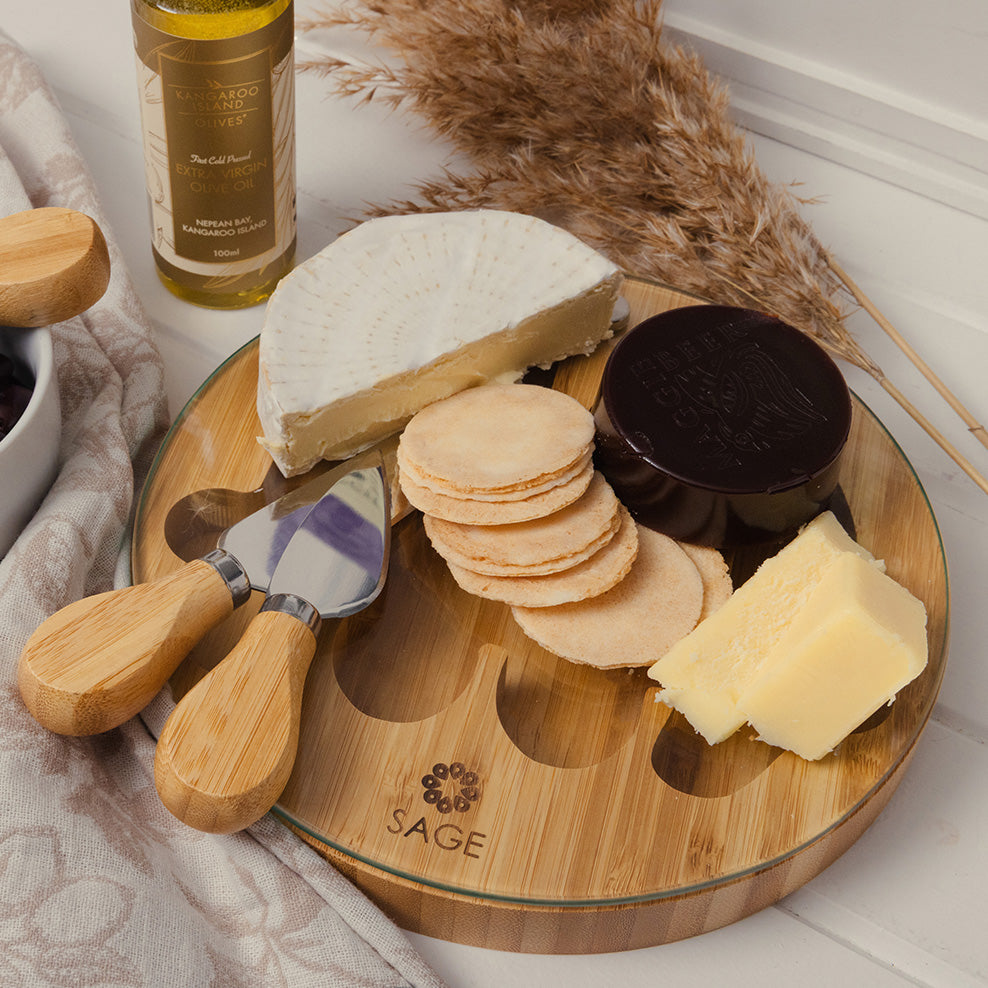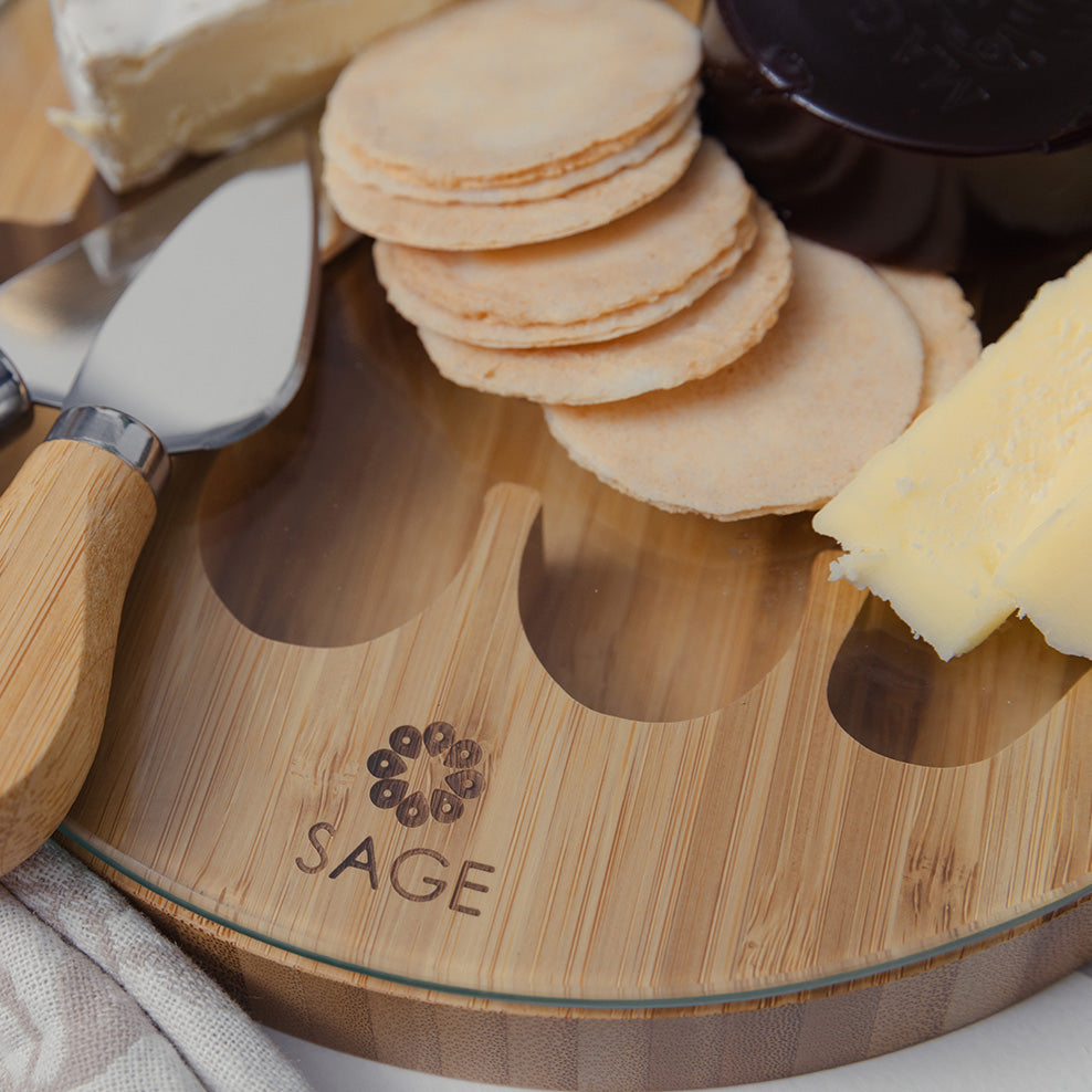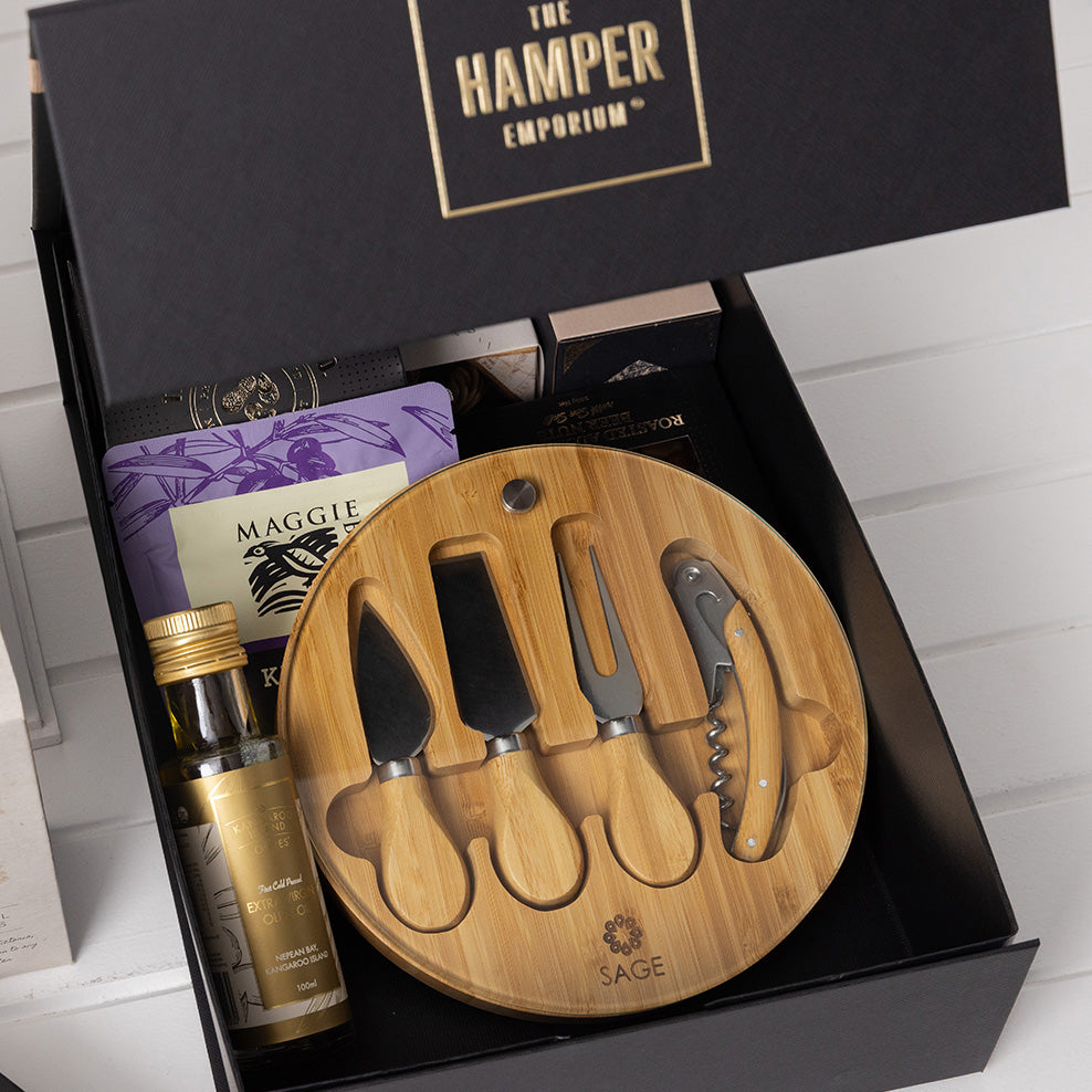 An epicurean gift complete with a custom-branded cheeseboard for a personal touch.